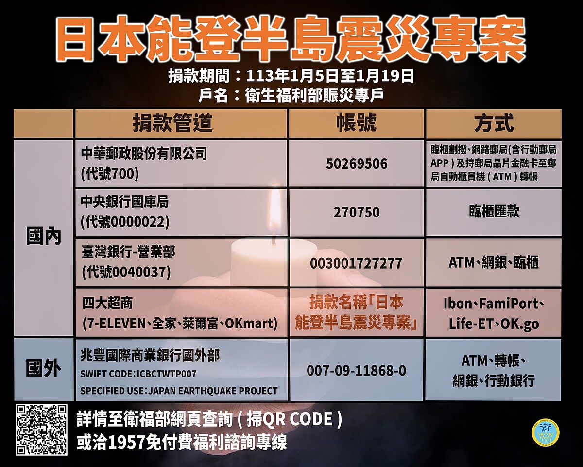 民眾捐款時,請指定用途:「#日本能登半島震災專案」,於公告期間,衛生福利部賑災專戶的捐款,如無指定其他用途,一律視為該專案捐款。