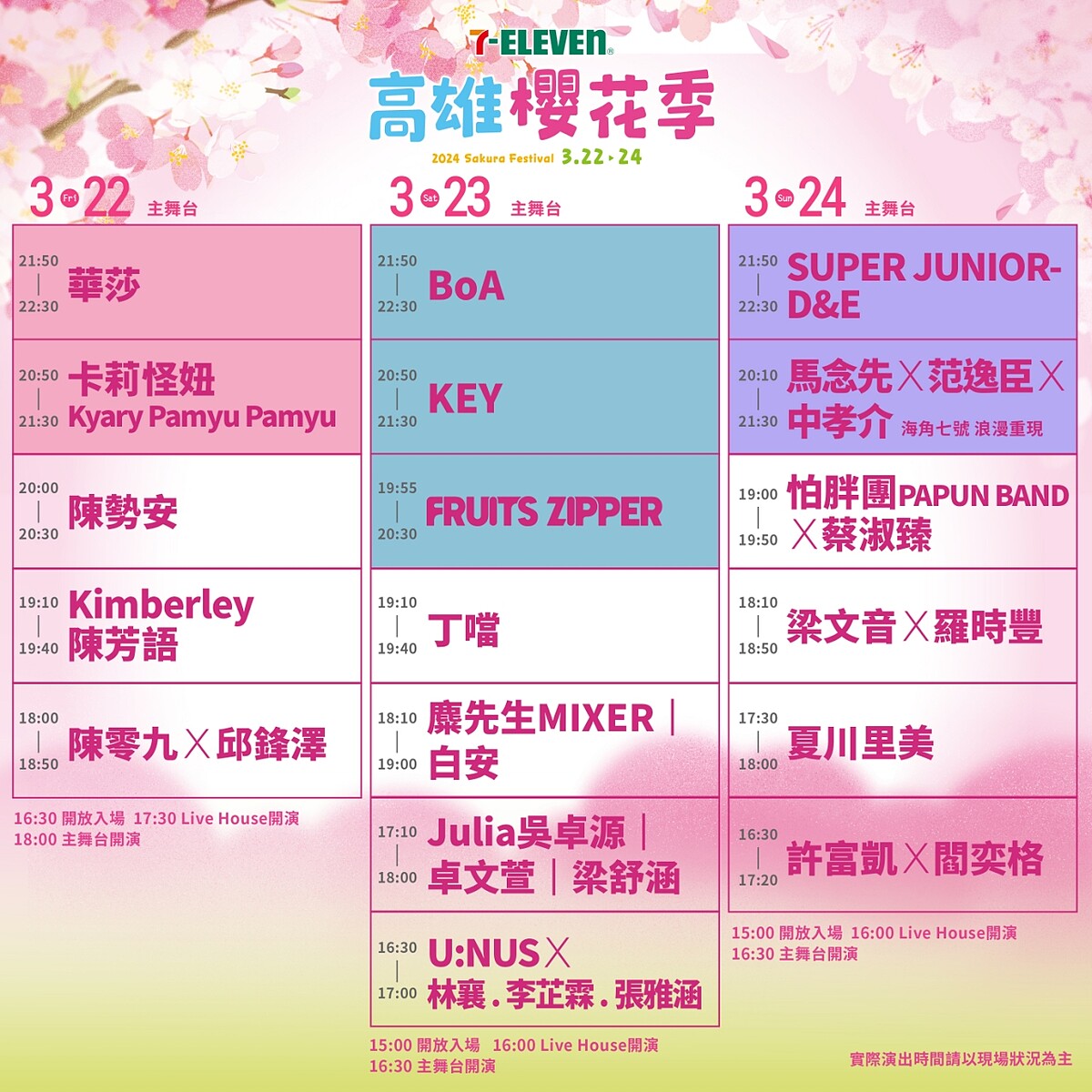 一票難求的《高雄櫻花季》音樂活動,受邀演出藝人將分布在各主題舞台輪番上陣,目前最新節目日期表已釋出,M編火速奉上讓大家參考,主舞台演出陣容有:BoA、DORA、FRUITS ZIPPER、Julia吳卓源、KEY、Kimberley陳芳語、SUPER JUNIOR-D&E、U:NUS、丁噹、中孝介、白安、卡莉怪妞Kyary Pamyu Pamyu、安芝儇、怕胖團PAPUN BAND、林襄/李芷霖/張雅涵、邱鋒澤、卓文萱、范逸臣、馬念先、夏川里美、梁舒涵、梁文音、許富凱、陳零九、陳勢安、華莎、瑟七、蔡淑臻、閻奕格、麋先生 MIXER、羅時豐;潮黑吧舞台部分的演出陣容則有:DJ Swallow妖嬌、icyball冰球樂團、小卡比、回聲樂團ECHO、板凳樂團、林俊逸、許莉潔、黑曜精靈Twinkle Black、露波合唱團…光是這些夢幻名單就讓人期待值拉滿!