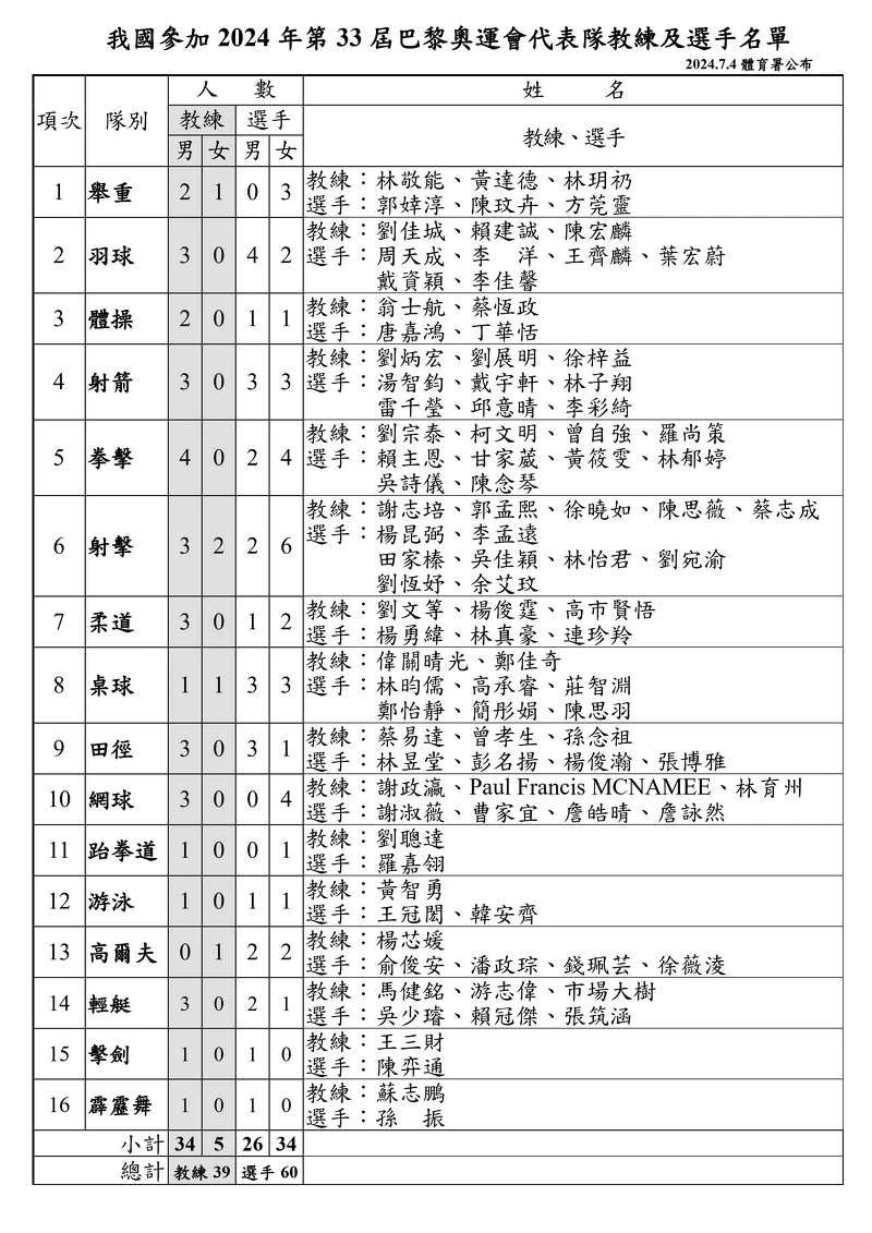 2024巴黎奧運台灣選手名單