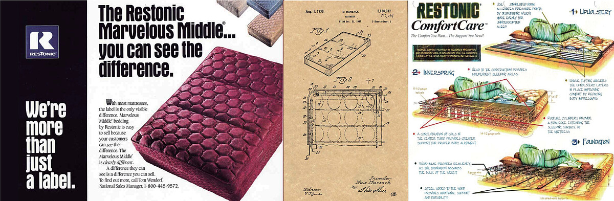 專注健康睡眠86年的Restonic美國蕾絲床墊,於1937年開始專精於研究床墊強化邊框科技與螺旋鎖科技之設計,使得床墊整體及床沿圍邊的平穩支撐性大幅提升,並在1939年獲得專利證書 (證書號NO.170205),而蕾絲床墊結構設計師Max Marsack更在同年提出床墊中間加強的概念,為Restonic美國蕾絲床墊提倡健康睡眠「Marvelous Middle中位護背線結構」奠下核心基礎。