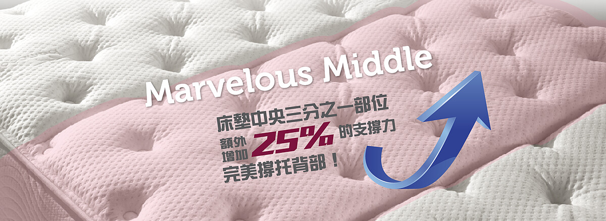 在長達26年多研究開發,並邀請2萬多人經過2,168,037次反覆試睡及調整床墊後,Marvelous Middle中位護背線於1965年正式成功註冊世界專利(專利證號:860558),試驗結果證實:Marvelous Middle 中位護背線,可有效緩解平躺時脊椎承受的壓力,使人體達到完全放鬆舒緩狀態,大幅減少腰椎與脊椎負擔,能提供更優質健康舒適的睡眠,並減少夜晚翻身次數,大大提升黃金深睡間,成為第一個有效改善腰部支撐性的床墊產品。上市至今風靡全球、熱銷上千萬張,在廣大消費者心目中,「Marvelous Middle 中位護背線」儼然成為健康床墊結構的代名詞。