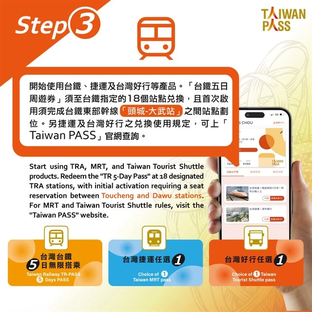「台鐵5日周遊券」至台鐵指定18個站點(臺東、花蓮、羅東、宜蘭、南港、松山、臺北、板橋、桃園、中壢、新竹、臺中、新烏日、嘉義、臺南、新左營、高雄、枋寮等)、出示Taiwan PASS APP後兌換,首次啟用後須完成台鐵東部幹線「宜蘭頭城-台東大武」之間站點劃位。