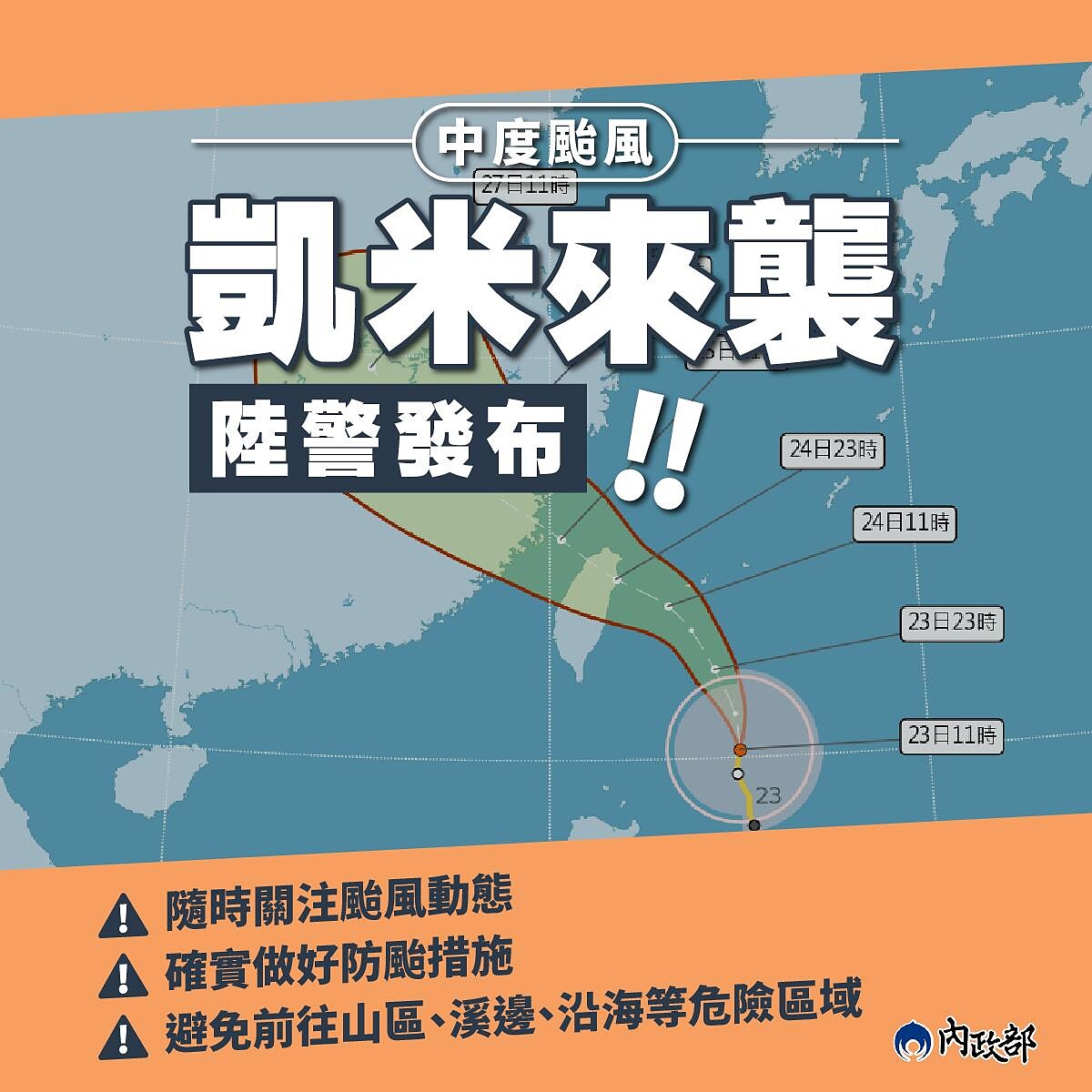 颱風「凱米」來襲洶洶,7/23早上已發佈陸上警報,且強度有逐漸增強、暴風圈擴大趨勢,只要事前準備好居家防颱措施,便可以減少受到颱風侵害!我們整理出提前準備工作、各大景點的預警性封閉情形,呼籲大家多加留意。