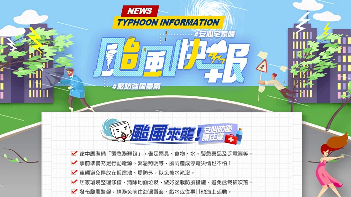 另外可上PChome 24購物「颱風快報」專區、台隆手創館「防颱用品安心購」採購防颱所需用品。