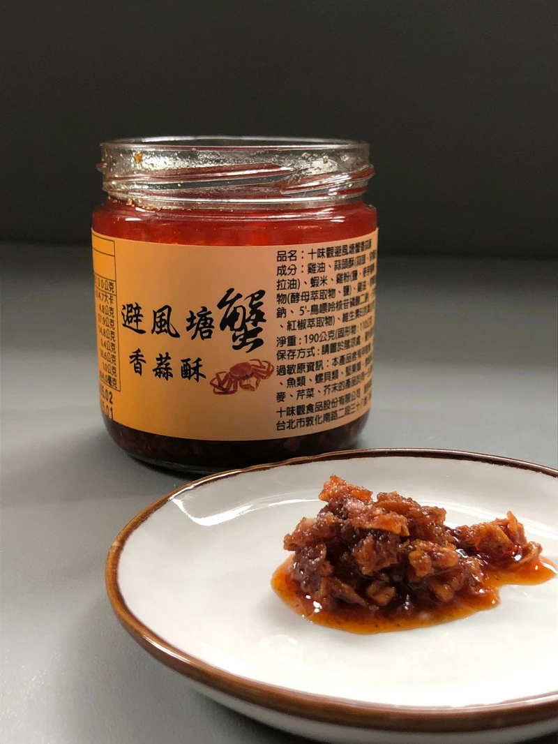 被譽為料理神醬的避風塘蟹香蒜酥醬,傳奇醬配方來自國泰集團創始人蔡萬春之長子蔡辰男的私人配方。因為「避風塘炒蟹」是他個人最愛的料理之一,因而創立全台獨家道地的港式風味避風塘蟹香蒜酥醬。醬料內除了蒜酥,也調入了沙蟹蝦米,一罐滿載遠洋鮮味。除了懶人喜歡簡單的拌飯拌麵都合適外,美食達人們還用來蒸蛋、蒸魚、炒海鮮,炒肉片都百搭,只要在料理的最後步驟,加入適量的蟹香蒜酥醬提香,就能讓簡單的食材變得滋味萬千!颱風天裡的奢華救贖。