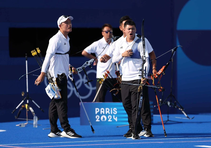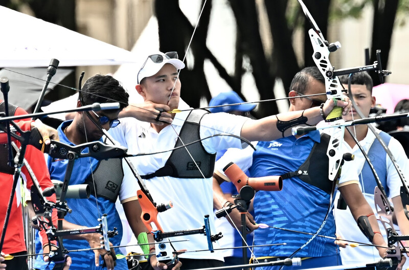 由湯智鈞、戴宇軒、林子翔組成中華射箭男團,這回征戰巴黎奧運8強賽對決中國隊,最後以1:5落敗,未能晉級4強。