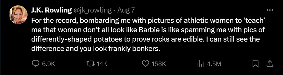 大量群眾湧入羅琳的社群貼文底下留言,並上傳女性運動員照片,希望將林郁婷誤認作「跨性別」或「雙性人」的這位英國名人,正視女性也可以擁有不同於傳統的面貌。8 月 7 日羅琳發布一則最新回應,形容這是「用不同形狀的馬鈴薯照片來證明石頭可以吃一樣」,她更在結尾強調「我仍然能看出差異」。