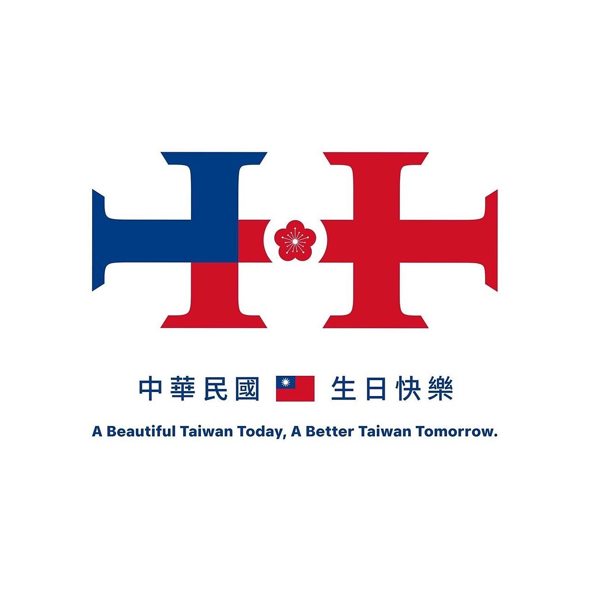 2024國慶的主視覺圖依舊以我們熟悉的紅、藍色、梅花作為主軸,並用英文寫下今天美麗的台灣,明天更好的台灣。