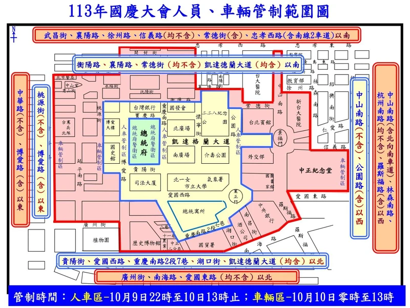 管制時間是人車區「10月9日22時至10日13時止」、車輛區則是「10月10日零時至13時」,這天需要出門的民眾要注意,才不會因為交通管制耽誤自己的行程喔。