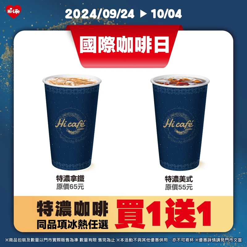 萊爾富即日起至10月4日期間,推出限時指定咖啡享同品項買一送一優惠吸客,消費者於指定活動期間至全台萊爾富咖啡販售門市,購買Hi café 大杯系列的特濃美式咖啡或特濃拿鐵咖啡,即享同品項冰熱任選買一送一。如果不太喜歡喝咖啡有沒關係,即日起至10月15日到萊爾富購買Hi café大杯系列的台味奶茶,享不限冰熱、單杯特惠只要49元。