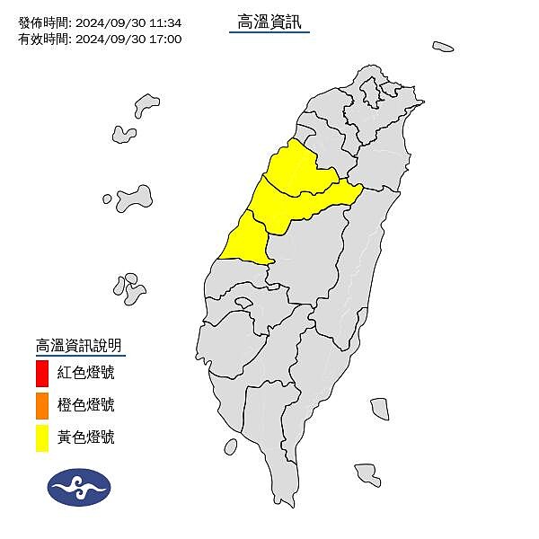 雖然颱風狹帶強雨和強風,但苗栗縣、臺中市、彰化縣仍要小心36度以上的高溫襲擊,09/30的17點前都要注意不要中暑,中央氣象署提醒:「減少戶外活動及勞動,避免劇烈運動、注意防曬、多補充水份、慎防熱傷害。室內保持通風及涼爽,適時採取人體或環境降溫的方法,如搧風或利用冰袋降溫等。適時關懷老人、小孩、慢性病人、肥胖、服用藥物、弱勢族群、戶外工作或運動者,減少長時間處在高溫環境。地形影響,背風側小區域可能產生焚風或類似焚風的效應,可架設防風設施或噴水、灌水降溫,防範農損。」
