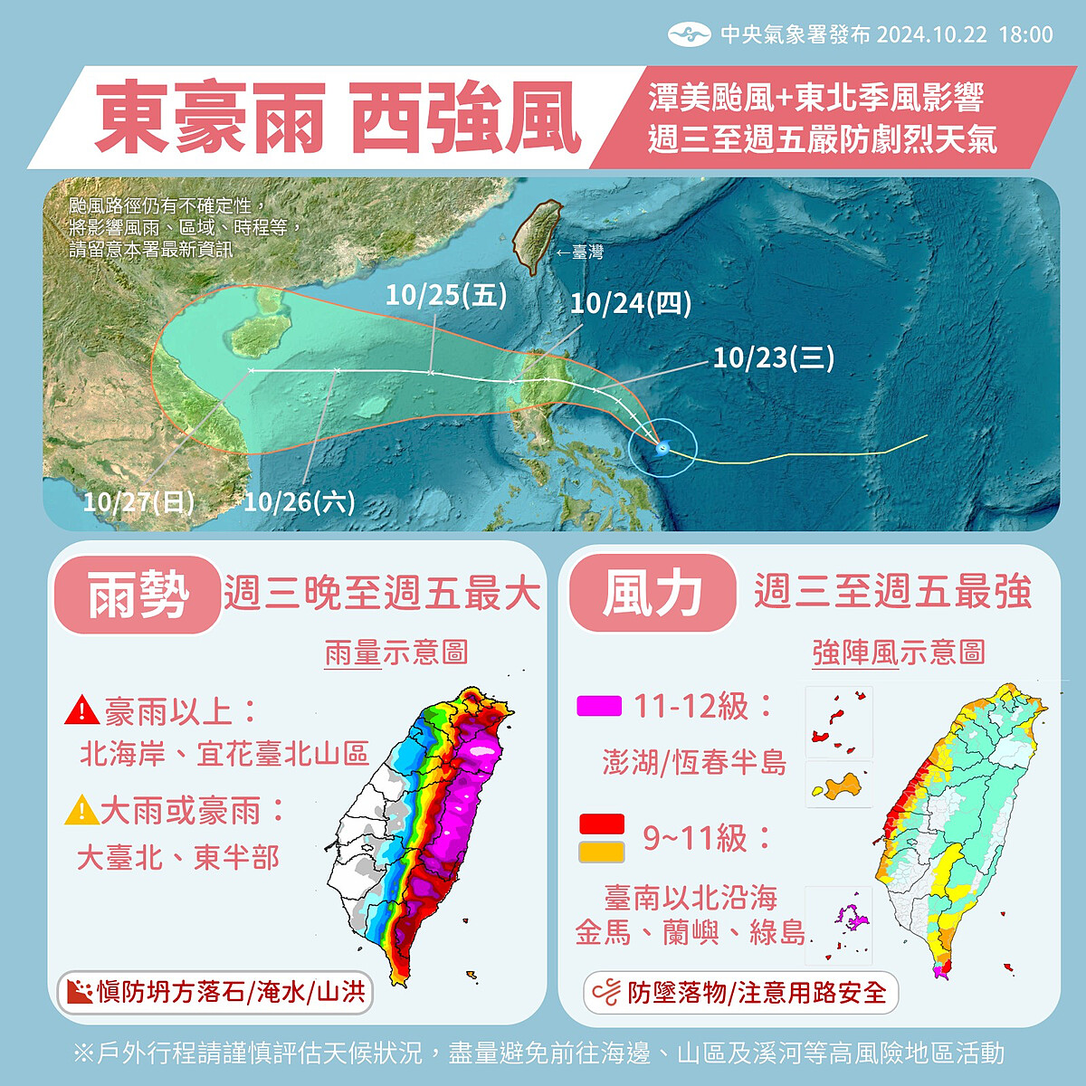 大家要注意的是,在潭美颱風外圍環流和東北季風的影響下,處於迎風面的宜花地區、雙北山區、北海岸將會有豪大雨襲擊,所以要特別留意是否有山區土石坍方、低窪處淹水等災害發生。