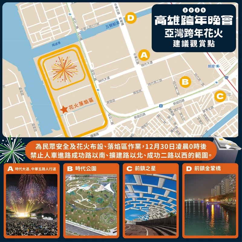 若要好好把高雄跨年煙火之美盡收眼底,那就得把高雄市政府公開的最佳觀賞點記下來!包含時代大道、中華五路人行道、金鞏橋、時代公園、前鎮之星都有絕佳視野,不妨早點出發卡位。而為了民眾安全與落焰區作業,12/30凌晨0點後將禁止人車進入成功橋以南、擴建路以北、成功二路以西的範圍。