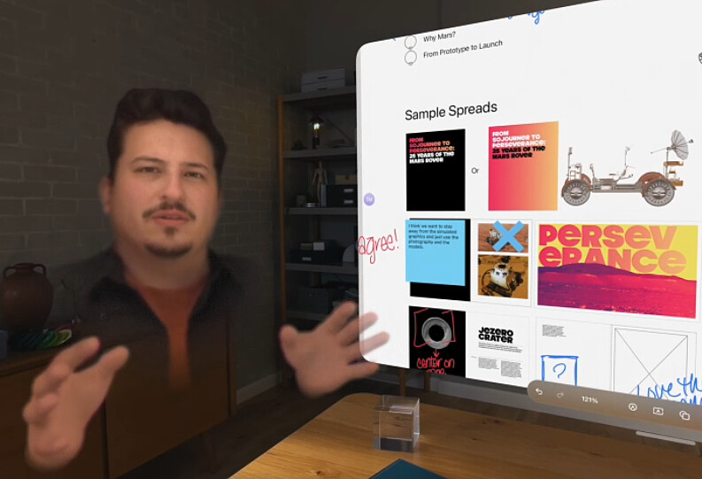 Apple Vision Pro透過Mac虛擬顯示器環繞使用者的可擴展超寬廣螢幕,帶來無限工作空間,可把它放在空間中任何位置,並將 Apple Vision Pro 當成巨型顯示器,既私密又方便攜帶。