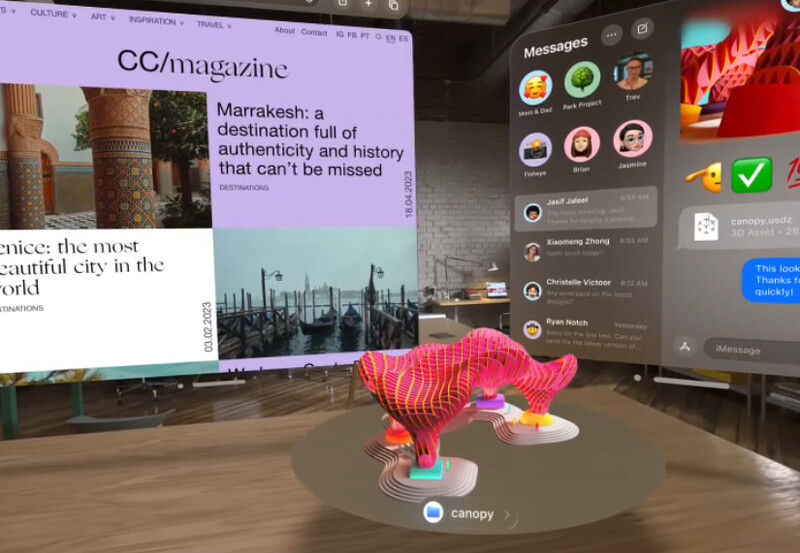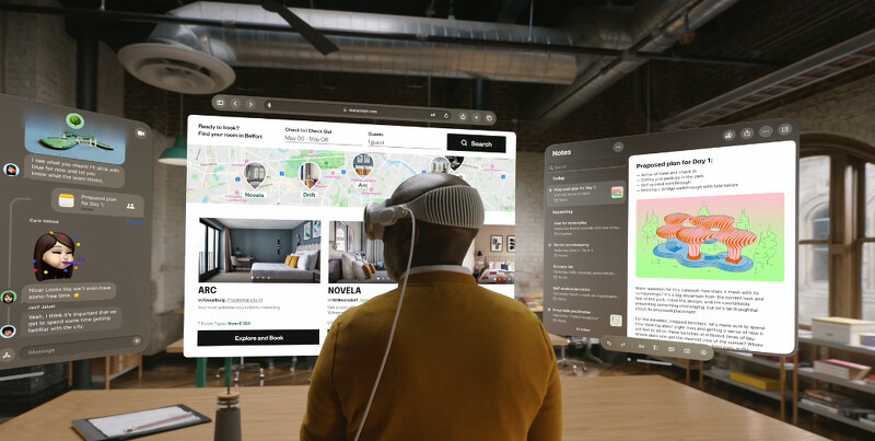 Apple Vision Pro透過Mac虛擬顯示器環繞使用者的可擴展超寬廣螢幕,帶來無限工作空間,可把它放在空間中任何位置,並將 Apple Vision Pro 當成巨型顯示器,既私密又方便攜帶。