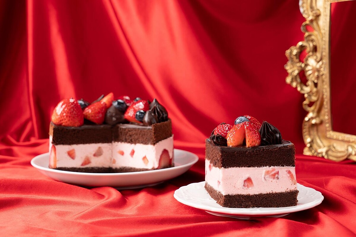 ‧覆盆莓草莓巧克力蛋糕:選用70%與100%苦甜巧克力,結合新鮮草莓與覆盆莓內餡,搭配戚風蛋糕,口感輕盈卻不失濃郁。