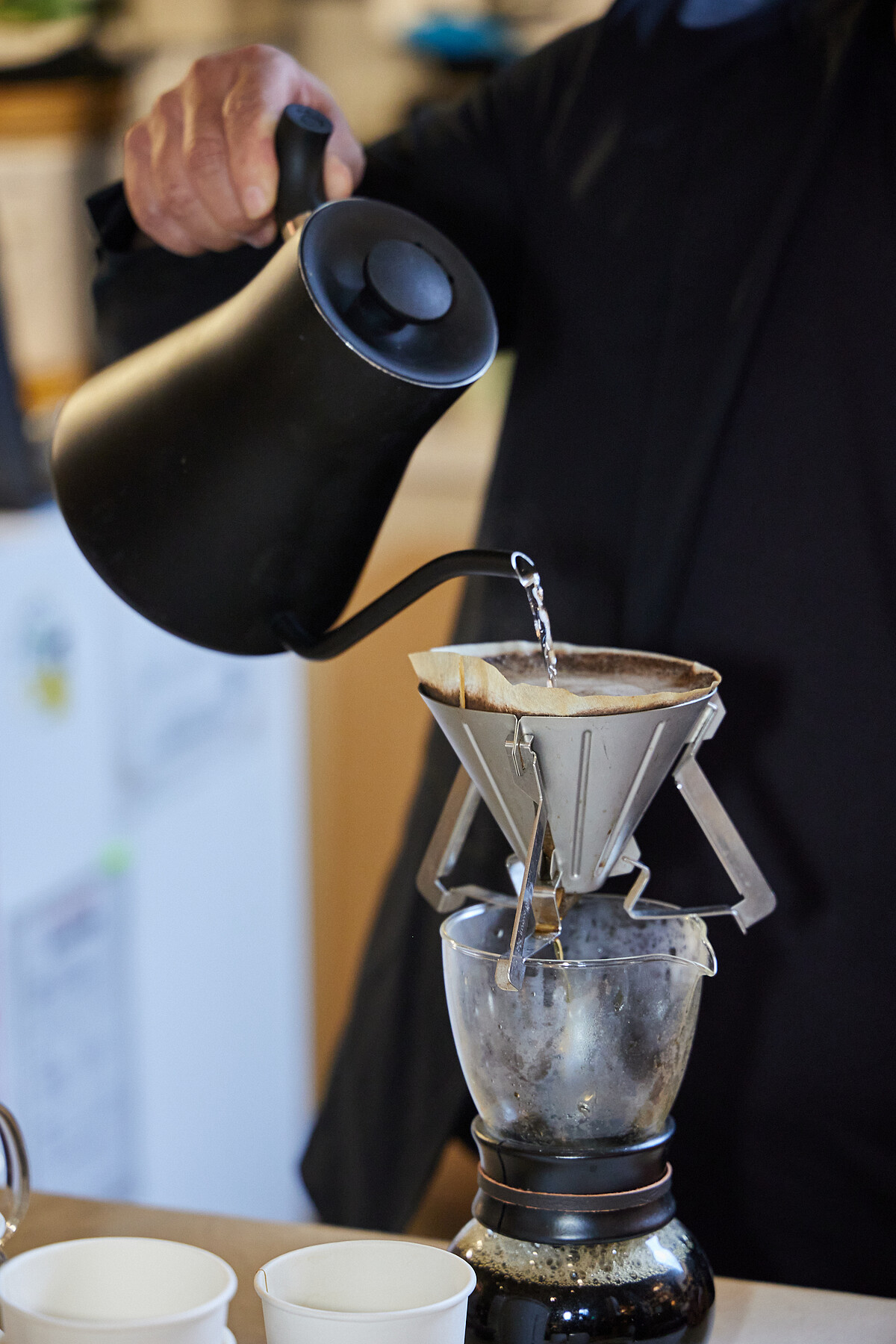 嚴謹製品,讓紐約時報曾以「邪教咖啡館(Cult Roaster)」一詞形容MORIHICO.森彥咖啡。而這樣的飲品魔法,不只源自嚴謹的選豆與烘豆過程,也來自市川草介堅持的沖泡手法。「泡咖啡的時候,最忌諱把手沖壺提得高高的、一直倒水,最好接近咖啡粉,然後再慢慢地倒水進去。」有別於一般所見的直水柱線條,他以特殊手勢所注入的水源,有時竟呈現如雨滴般的樣態,他解釋道:「這樣的方式像是在輕輕觸動它,這也是最難的一部分。那就像是以下了一場小雨的方式,接觸如乾枯大地的咖啡粉。充分浸潤之後,才會持續加放熱水。」