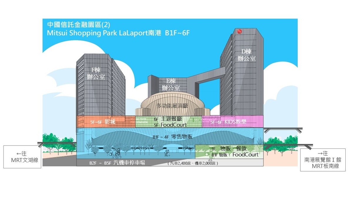 與販售過季商品、優惠價格的MITSUI OUTLET PARK不同,Mitsui Shopping Park LaLaport是以當季、正價商品為主的區域型購物中心,繼2023年5月於台中開幕後,第二間據點就選址南港軟體經貿園區。鄰近「捷運板南線」「捷運文湖線」,並與周遭開發案會以連通空橋串聯,提升個建物之間的往來便利性。涵蓋B1~6F,除了有多元商品業態選擇,更會透過舉辦各種文化與教育兼具的互動體驗、情報交流等活動,期望成為區域社會核心。
