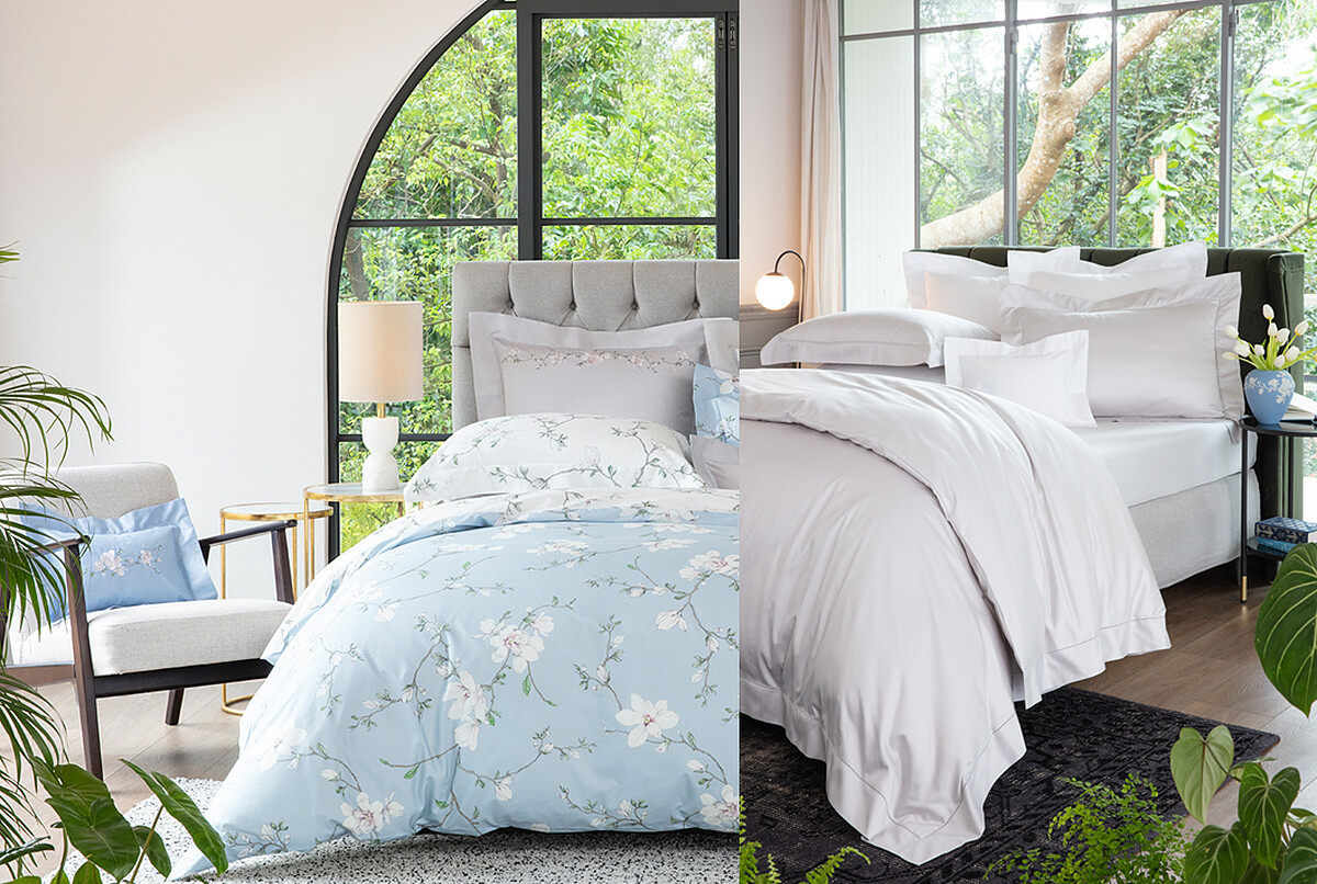 以 Wedgwood 經典瓷器為靈感,出自義大利工坊的雙面印刷,並以潔白木蘭花圖騰正面浸染於春日晴空藍、背面則以無暇白皙襯托花朵的清新床寢,完美輝映出溫婉柔軟樣貌。