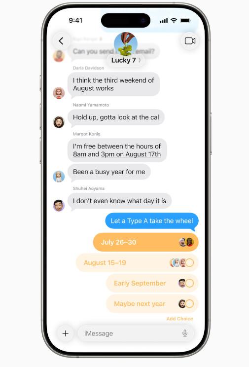 iOS 26 也強化對話體驗,提供自訂背景和建立投票的功能。藉助 Apple Intelligence,「訊息」能偵測出適合使用投票的時機並提供建議,使用者也可以運用「影像樂園」生成符合對話內容的獨特背景圖。
