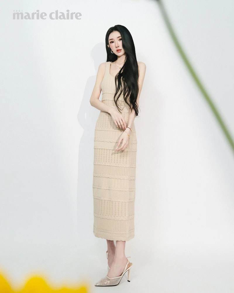 米色針織背心、米色針織半身裙,both by Club Monaco;米色高跟鞋,Charles&Keith。 莉 森LANG STAR ID 11111旅行是我與自己獨處的靜音時刻