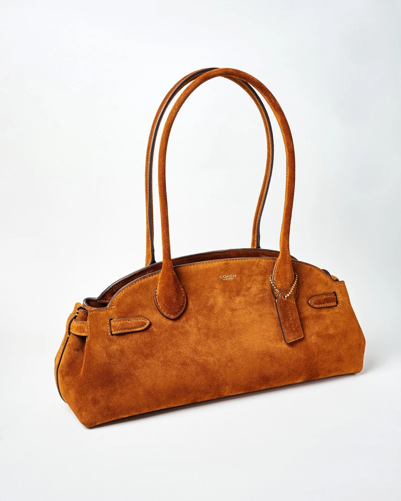 擺脫深棕專屬秋冬的刻板印象,2025春夏流行色更被棕色、灰棕這類型中性色取代,為穿搭添加咖啡細節不但點綴高質感,也散發出沈穩大人系。略帶復古的橫長包型,擁有大收納空間,表層面料則以絲絨般柔軟的麂皮製成,為都會女性的穿著搭配增添不一樣的時尚亮點。