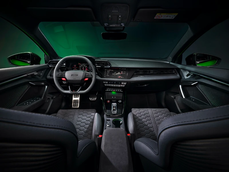 在展示間內拍攝時,不知哪家媒體調皮地啟動引擎,洩漏出一絲低音砲怒吼,讓人熱血微微沸騰了起來。Audi備受讚譽的標誌性1-2-4-5-3 五缸聲浪在 2,200–3,500 rpm 間透過可變閥門釋放更渾厚的音色。就連知名外媒《Top Gear》都在試車報導中特別提到Audi RS 3五缸引擎的聽覺魅力:「聲浪依然是同級獨一無二的存在,無論是在山路還是市區低速,駕駛者都會忍不住多聽幾次」。