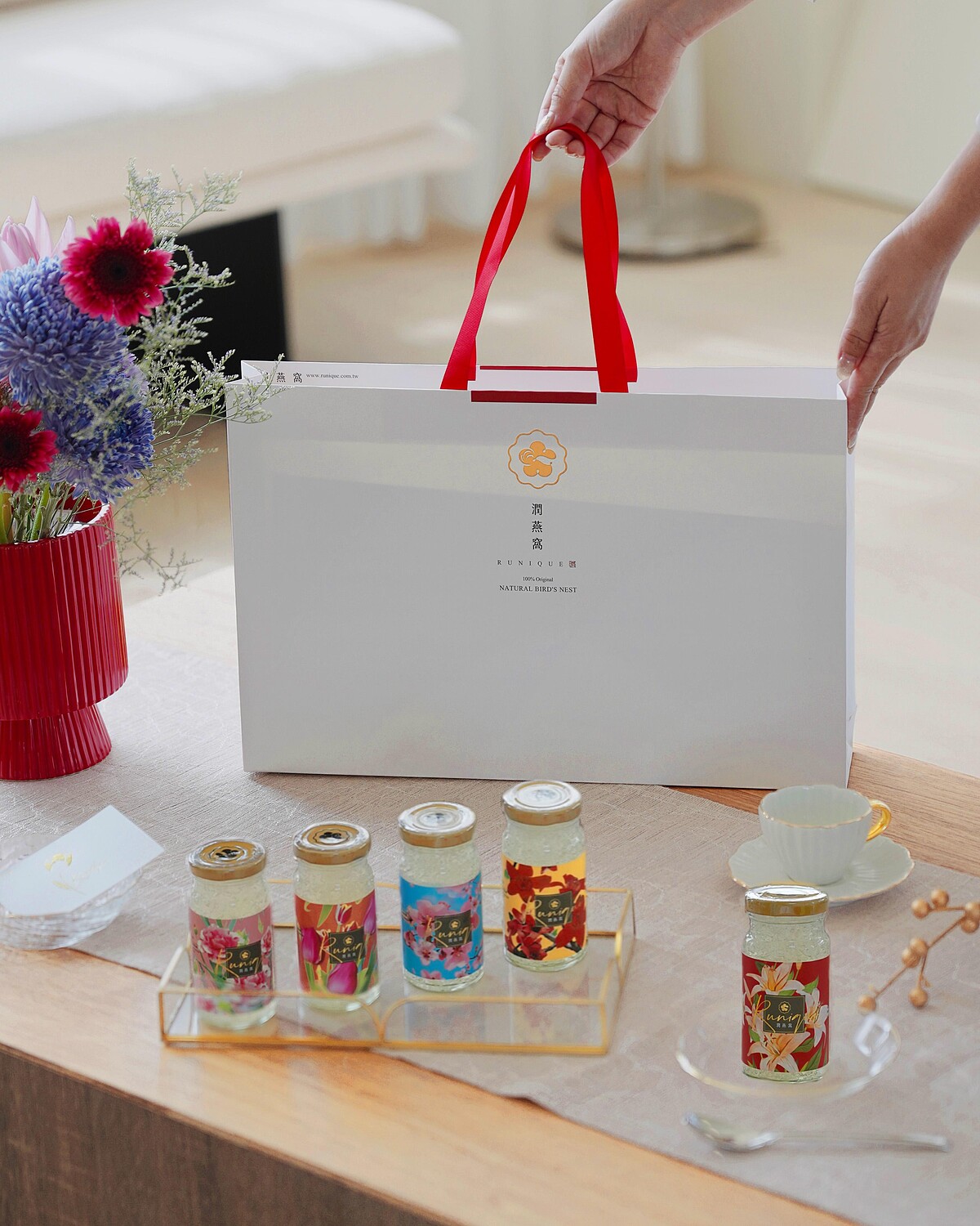 收到百花真燕禮盒的瞬間,優雅純白搭配燙金細節的白金禮盒映入眼簾,展現節慶儀式感與高貴質感。每一瓶「24K極濃燕窩」以不同花語設計,巧妙傳遞康乃馨的柔情、梅花的堅定、木棉花的幸福、百合的真摯與鬱金香的感恩祝福。