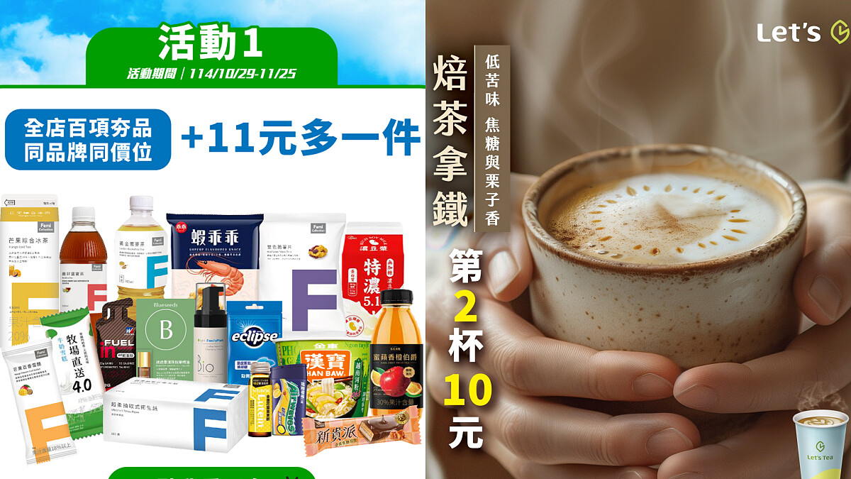 全家今年祭出史上最狂雙11,即日起至11/25,百項夯品加11元多1件、百樣商品5折起、單筆訂單結帳金額滿111元即可獲得一張抽獎券,可抽111杯Let'sCafe大杯經典拿鐵,更有機會獲得哥斯大黎加10萬元旅遊金。為了讓各位「加焙快樂」,也推出Let's Tea焙茶拿鐵第二杯10元,剛好適合天氣轉涼時和同事、朋友一起享用。