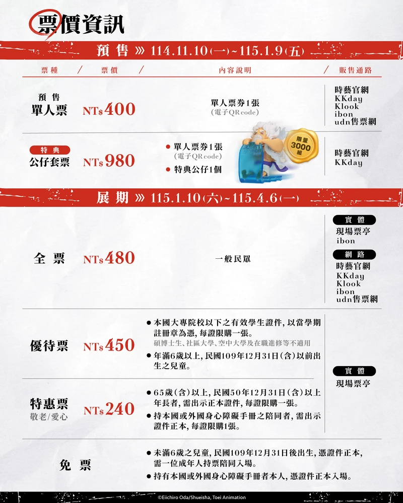 展期特惠票:240元(65歲(含)以上,需出示正本證件)