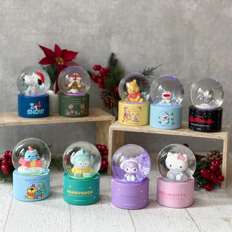 直徑8公分的大型水晶球,集結Hello Kitty、奇奇蒂蒂、咖波、KUROMI、SNOOPY、哆啦A夢等9大人氣肖像,底座具備七彩夜燈功能,自11月26日上午11點起限量預購。