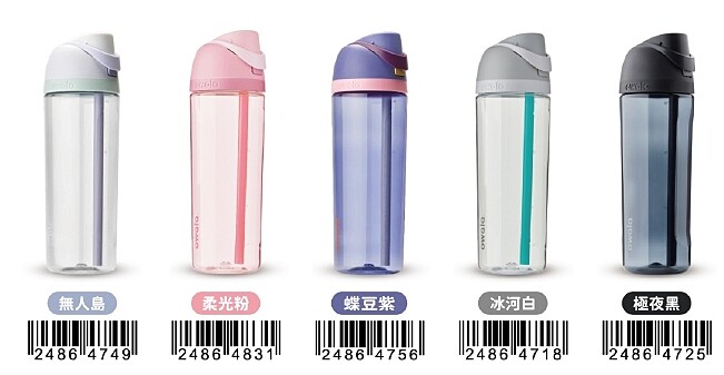 另一款主打輕量化的「Tritan透亮雙飲口吸管水壺」兼具耐摔與安全特性,適合日常隨身攜帶。瓶身設有雙刻度標示,方便記錄每日飲水量,深受健身族與運動愛好者喜愛。外型以透明感為特色,推出「無人島、柔光粉、蝶豆紫、冰河白、極夜黑」5種配色。