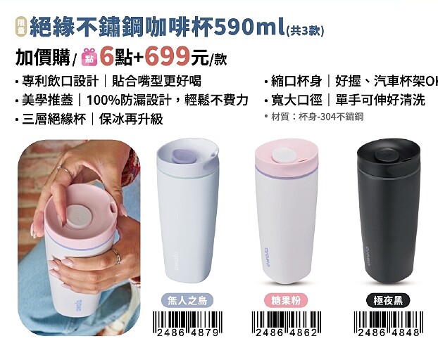 「絕緣不鏽鋼咖啡杯」主打專為日常通勤與外帶咖啡族設計的實用細節,縮口杯身不僅好握,也能輕鬆放入汽車杯架。配色則推出「糖果粉、無人之島、極夜黑」3款,從可愛到低調皆有選擇,成為咖啡控日常外出新選項。