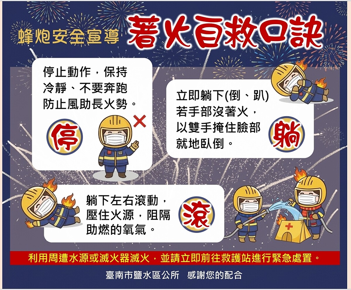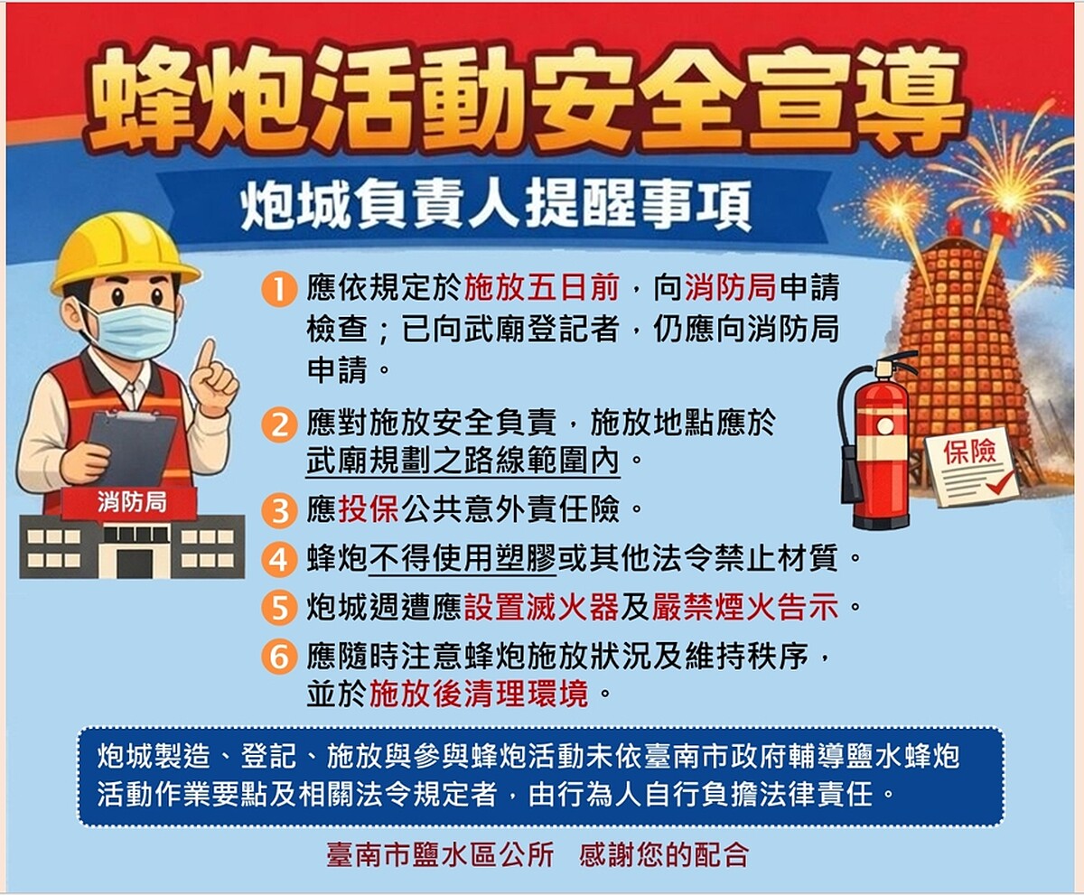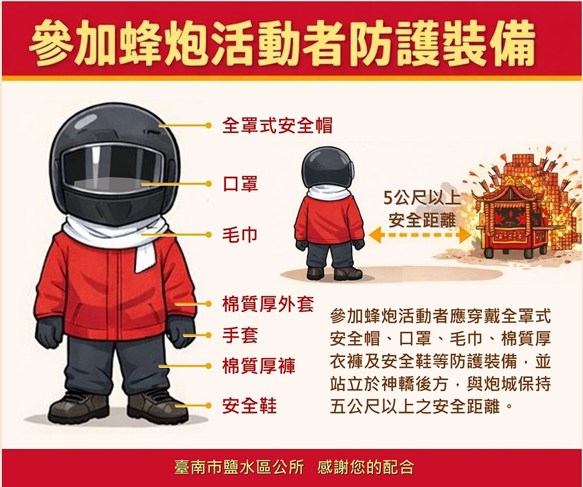台南市政府消防局提醒,參與蜂炮活動必須穿著「非可燃性材質」衣物,並保持至少10公尺的安全距離。