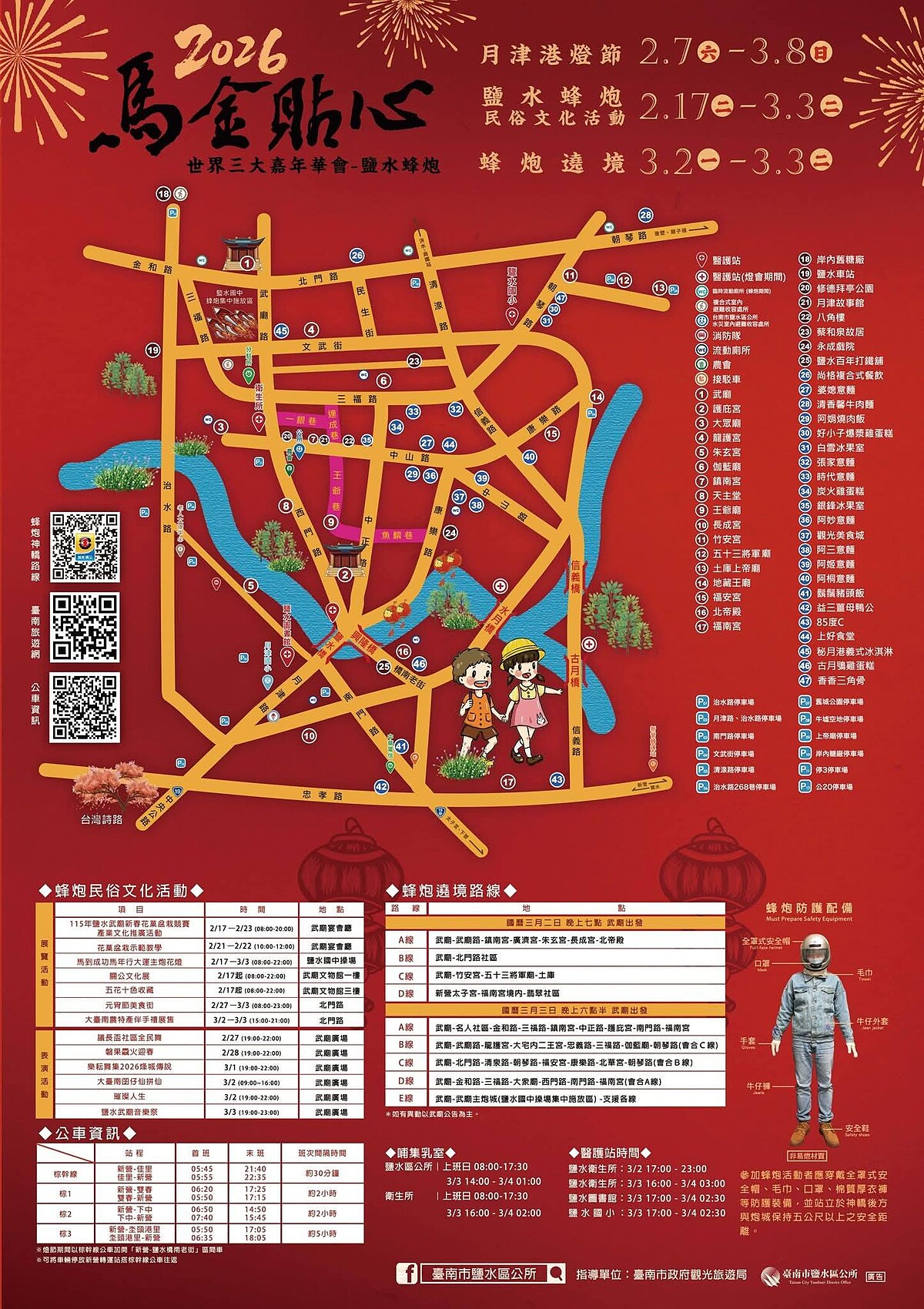 被譽為世界三大民俗慶典之一、國際媒體瘋傳的台南鹽水蜂炮登場啦!2026年適逢馬年,主辦單位鹽水武廟以「馬到成功馬年行大運」為主題打造多座特色花燈炮城,邀請全國民眾在3月2日至3月3日來到鹽水,感受這場結合除疫傳說與感官震撼的百年祭典。