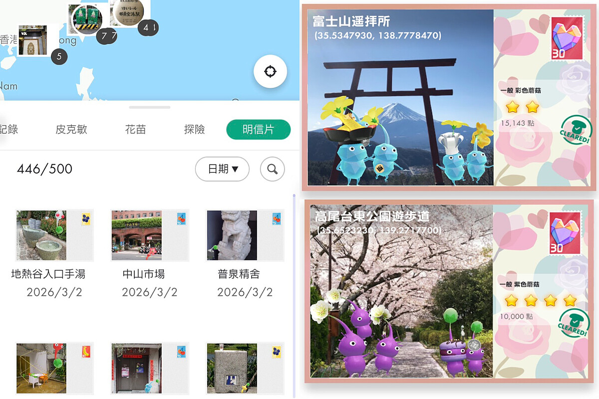 4.遠征與蘑菇挑戰:派皮克敏去撿拾路邊的資源,或與別人組隊挑戰蘑菇獲得獎勵與明信片,增加社群互動。