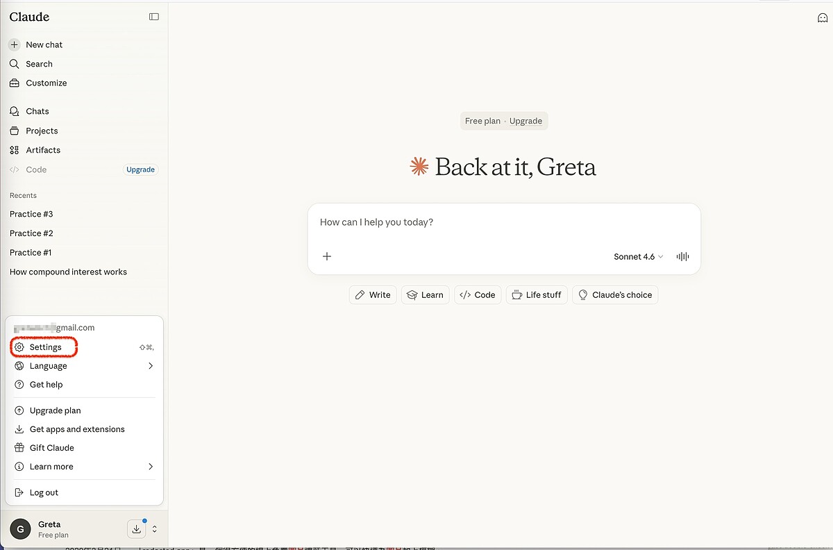 在搬家之前,先到 claude.ai 用 Google 帳號或 Email 註冊,完成後就能免費開始使用,手機版(iOS、Android)和桌面版(Mac、Windows)也都有。如果你用過 ChatGPT 或 Gemini,Claude 的介面不會陌生,就是一個輸入框,邏輯幾乎一樣。目前介面語言還沒有繁體中文,但直接用中文對話完全沒問題。