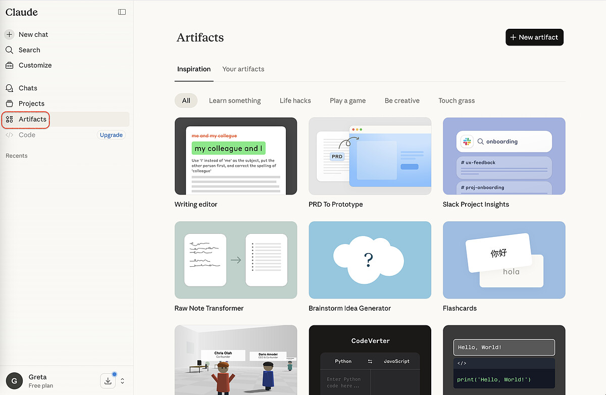 使用方式很直覺,只要你的需求夠具體,Claude 會自己判斷要不要生成。不知道從哪裡開始?打開左側面板的 Artifacts 區塊,裡面有 Anthropic 整理的範例,從互動遊戲到資料視覺化都有,可以直接試玩,或以此為起點改造成自己需要的工具。