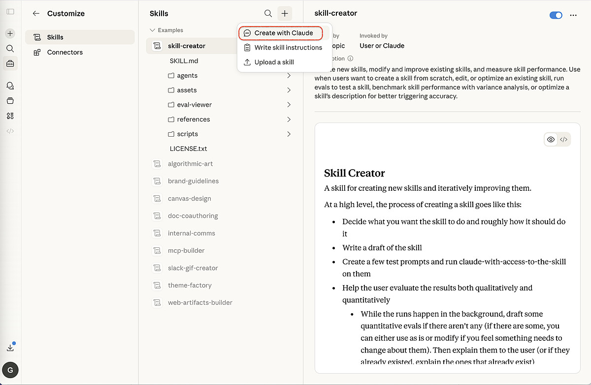 想建立自己的 Skill,到 Customize → Skills,點右上角的「+」,選「Create with Claude」,用對話的方式跟 Claude 描述你的需求,它會引導你一步步把 Skill 建出來,不需要自己寫任何設定檔。