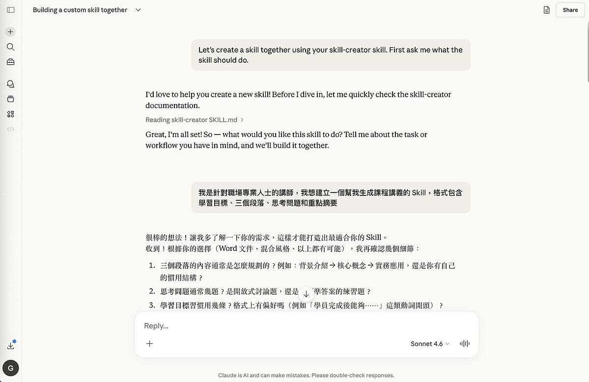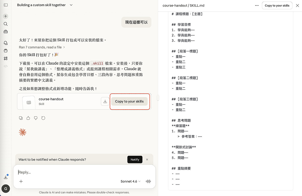 以筆者的另一個身份講師工作為例,告訴 Claude「我是針對職場專業人士的講師,我想建立一個幫我生成課程講義的 Skill,格式包含學習目標、三個段落、思考問題和重點摘要」,它就會在對話中釐清你的需求,接著幫你把整個 Skill 產出來。右側視窗會即時預覽結構,確認沒問題後按「Copy to your skills」,Skill 就正式安裝完成了。