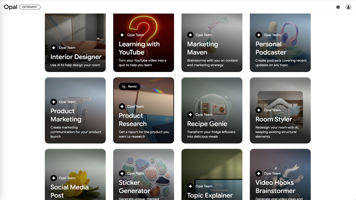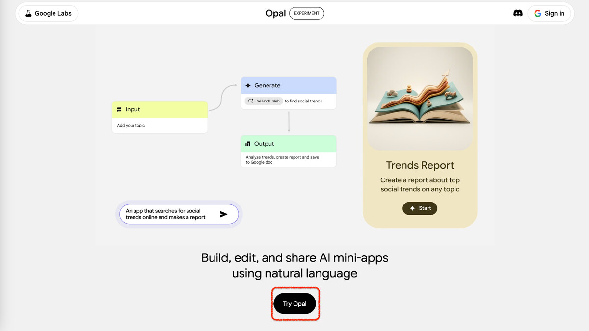 Opal 讓你用自然語言,把 AI 模型和各種工具串接在一起,做出可以分享給別人用的迷你應用程式。重點是完全不用寫任何一行程式碼。