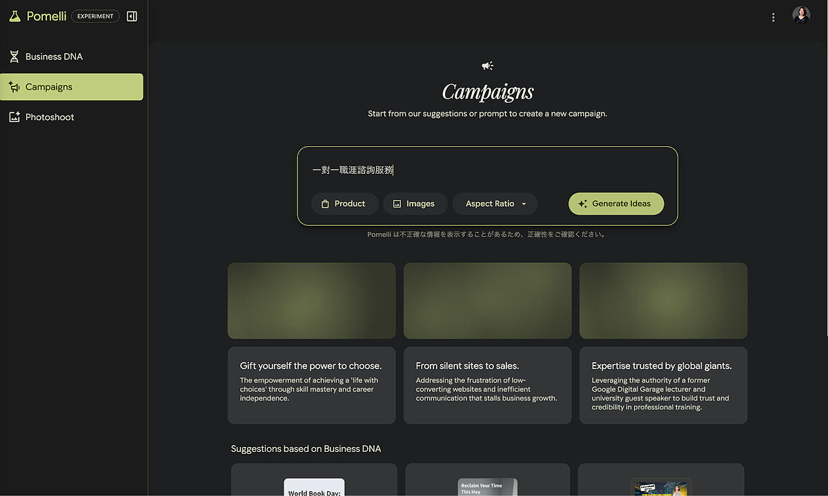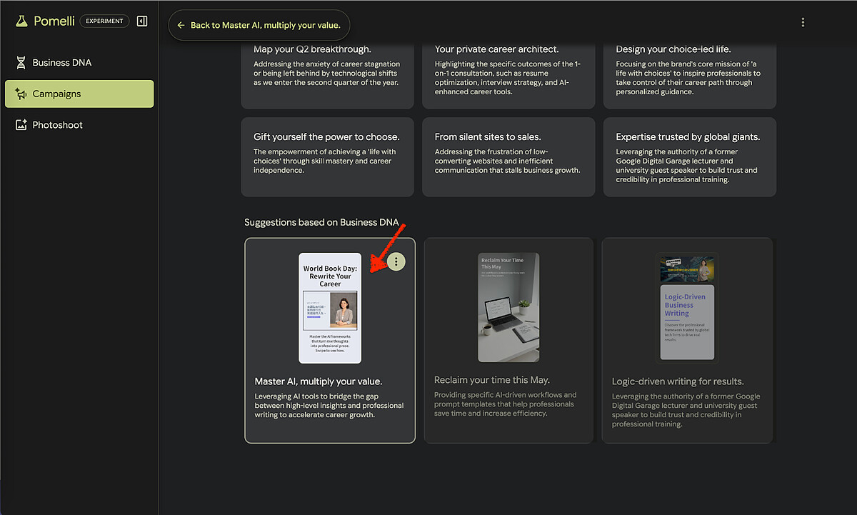 Campaign 就像你的行銷企劃助理。在提示框輸入你想做的活動,比如「母親節特別企劃」或「推廣新款耳環」,Pomelli 就會根據品牌 DNA 一次生成好幾組行銷活動概念,每組都有不同的切入角度和文案方向。選定之後,所有素材都能在工具裡直接編輯文字和圖片,滿意後一鍵下載。如果一時沒有靈感也沒關係,Pomelli 會主動根據你的品牌屬性推薦活動方向,等於連「今天要做什麼行銷」都幫你想好了。