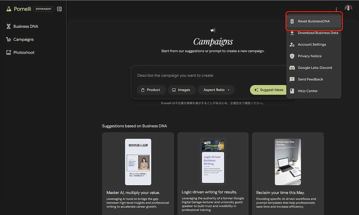 如果想要抓取其他網站的內容,只要在右上角三個點點開,「Reset BusinessDNA」,即可重新回到一開始的流程。