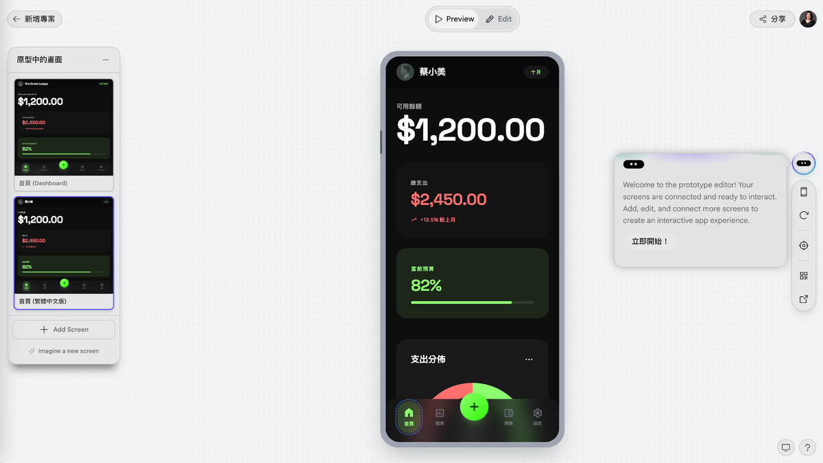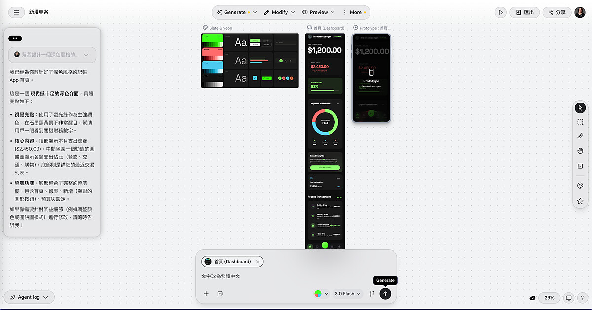 舉個例子,你可以跟 Stitch 說:「幫我設計一個深色風格的記帳 App,首頁要有本月支出總覽和圓餅圖」,它就會生成好幾個畫面讓你挑選。覺得哪裡不滿意,可以直接在畫布上點選那個元素,告訴它要怎麼改。