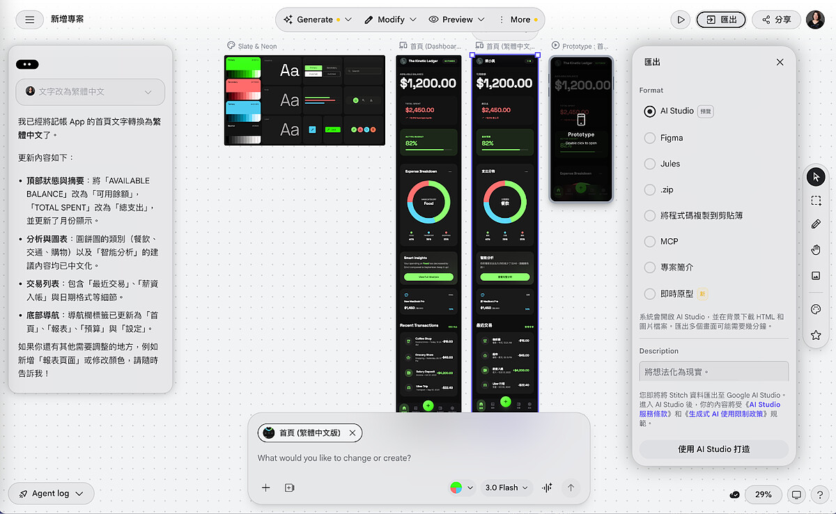 設計完成後,Stitch 不只讓你看看而已。右側的「匯出」面板提供了多種輸出格式。你可以匯出到 Figma 繼續精修、送進 Google AI Studio 產生可運作的程式碼,甚至下載成 .zip 檔案自己部署。如果你身邊有工程師夥伴,也能一鍵將程式碼複製到剪貼簿直接交接。換句話說,Stitch 不只幫你「畫出來」,還幫你把設計到開發之間那道最花時間的鴻溝直接跨過去了。