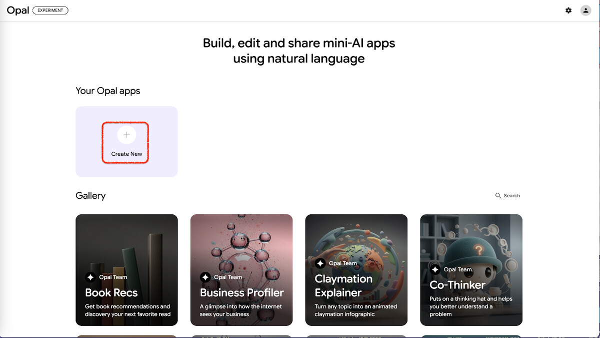 如果現有模板不夠用,你也可以從首頁這邊「Create New」,用自然語言從零描述想做的工具,Opal 就會自動幫你組裝出來,不用寫任何一行程式碼。