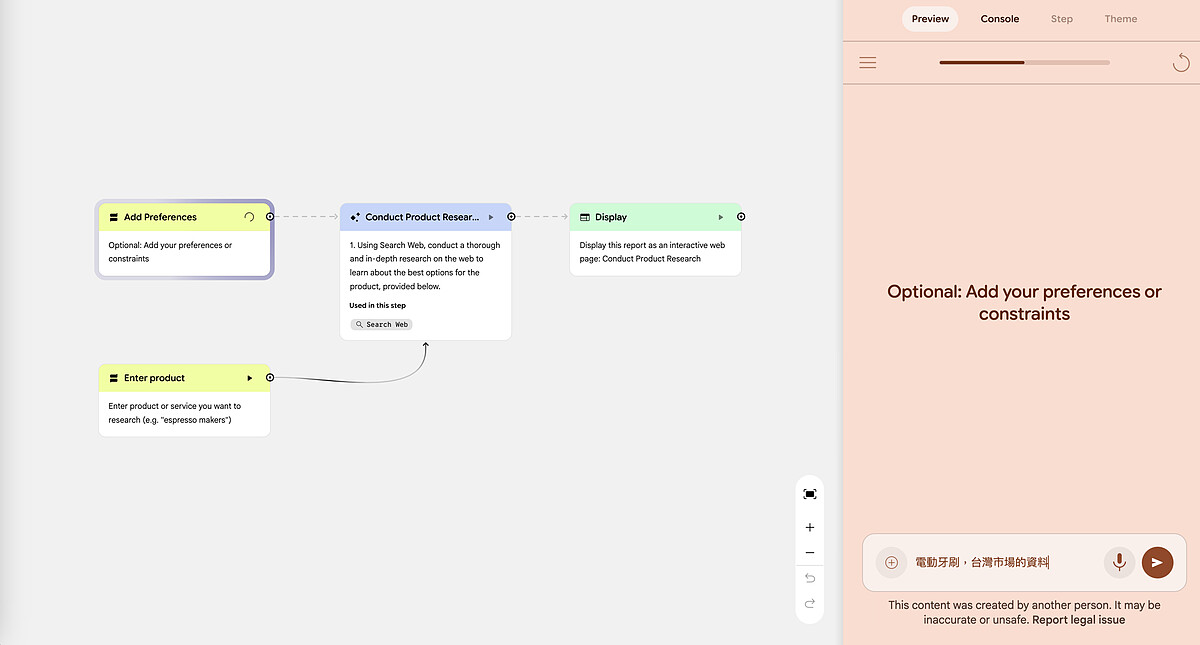 Opal 的運作邏輯有點像是「用說的來組裝樂高」。你跟它描述「我想要一個工具,可以幫我做某件事」,它就會把適合的 AI 模型和功能串在一起,變成一個可以執行的小應用。如果結果不滿意,繼續用自然語言調整就好。