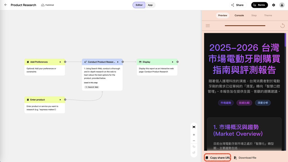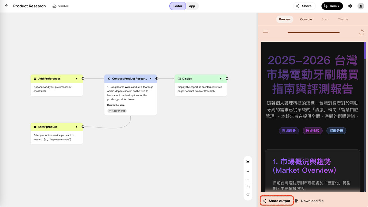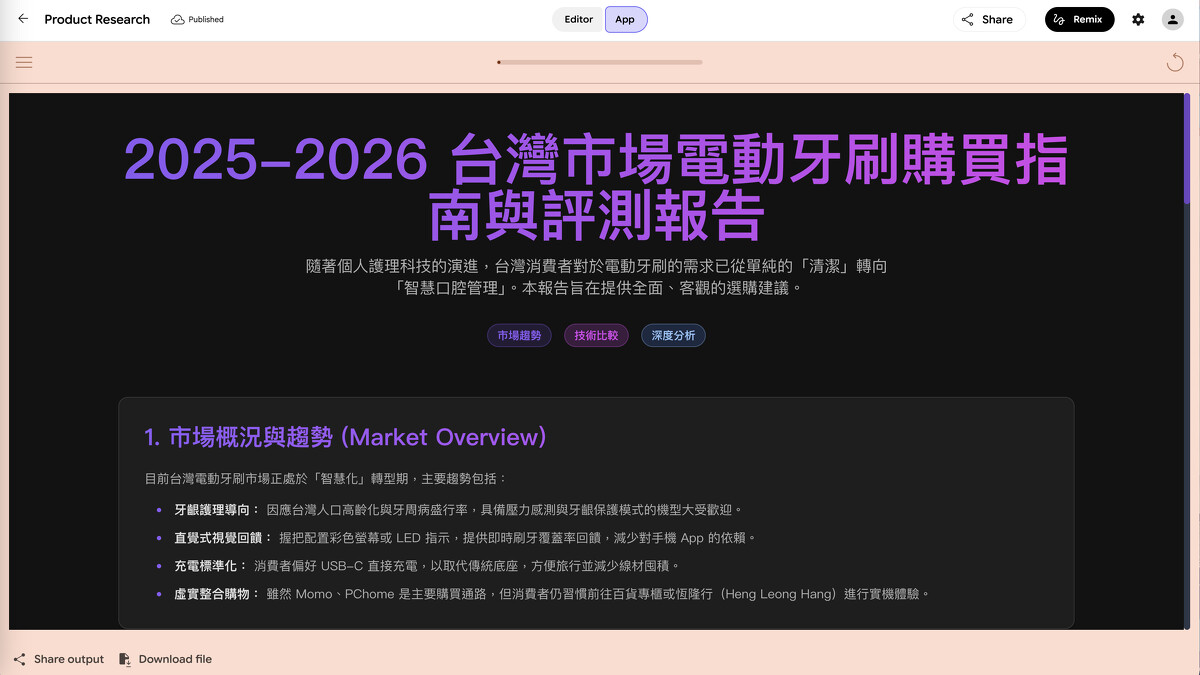 左邊是 Opal 自動組裝的工作流程:輸入產品名稱 → 加入偏好條件 → AI 上網搜尋並研究 → 產出報告,右邊就是最終結果。我輸入「電動牙刷」,幾分鐘後它生成了一份完整的台灣市場購買指南,包含市場趨勢、技術比較和深度分析。