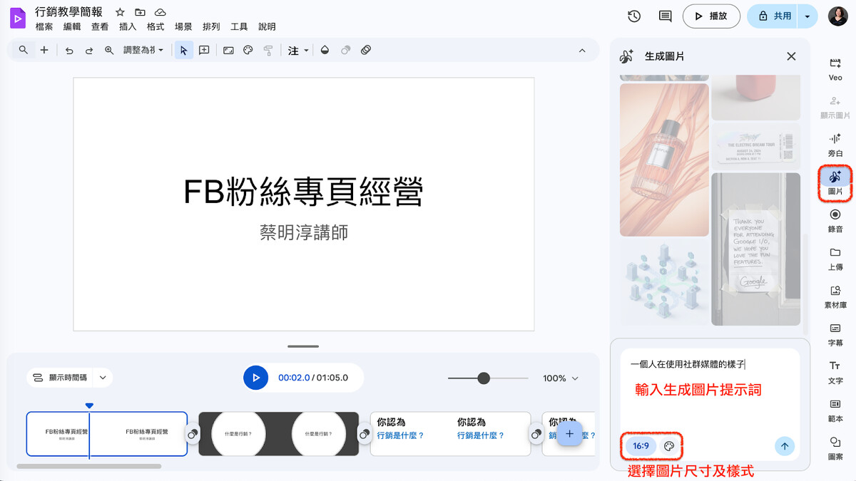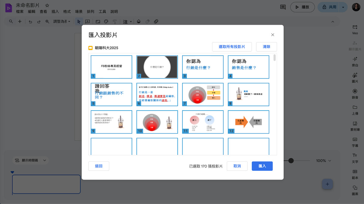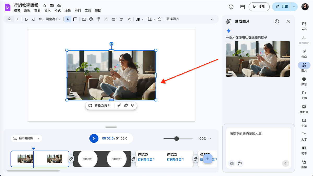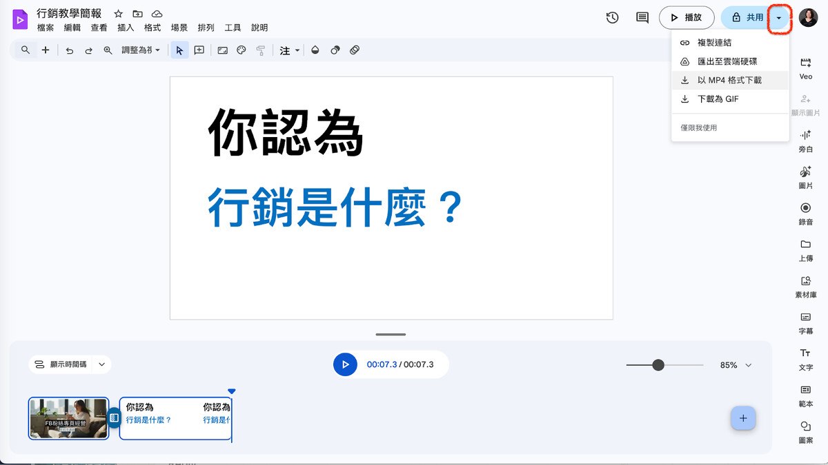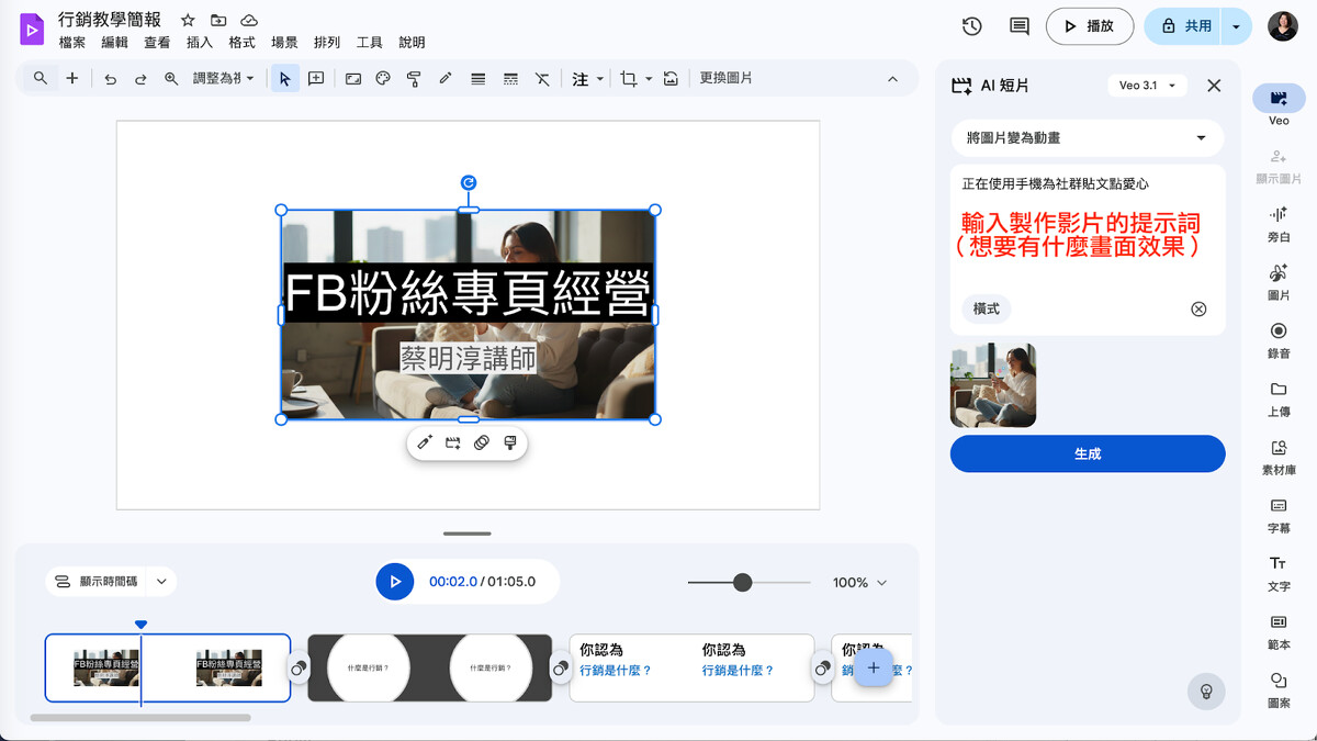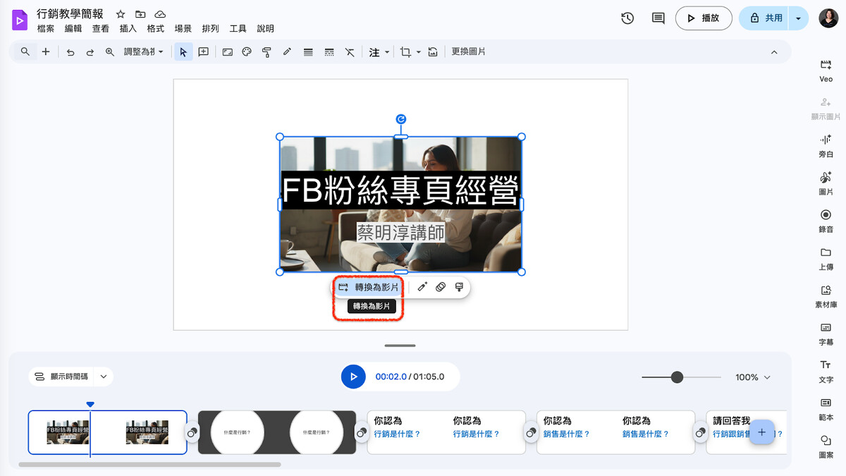 嫌投影片轉換成影片太單調?在右手邊選單有許多工具可使用,包含 Veo 製作 AI 影片、 Nano Banana 生成圖片、錄音、素材庫新增素材、上字幕、及重點文字可加入。