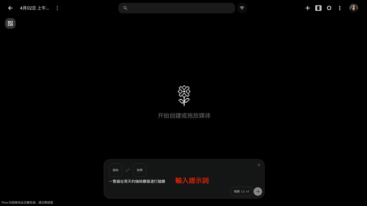 對話框輸入提示詞。也可以上傳圖片來生成影片,並且有「起始」到「結束」功能,你可以分別指定影片的第一幀和最後一幀畫面,AI 會自動生成中間的動態過程。